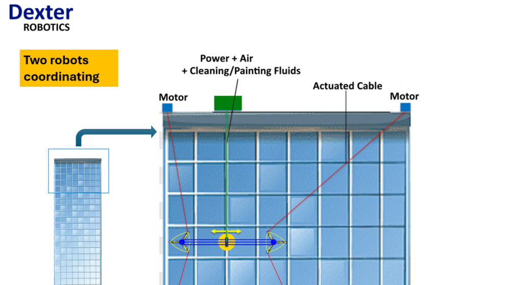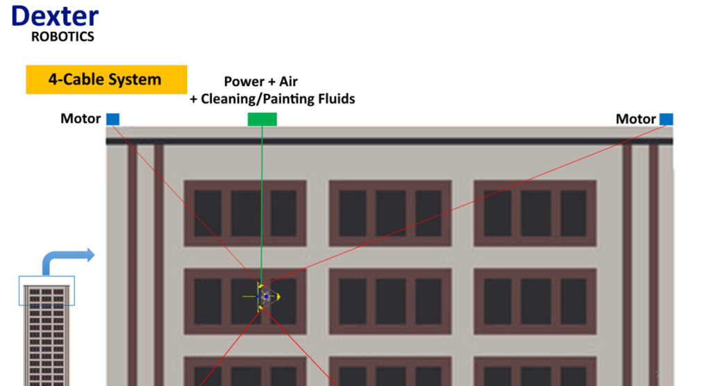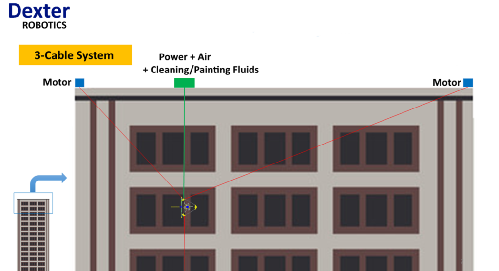 The schematic below depicts the second method. The Climbing Cling robot can be driven by three or four motorized wires (cables) as shown below. To achieve a much faster motion, a setup with two coordinating robots can also be used. In this case, the cleaning/painting module traverses along a beam installed between the two robots.