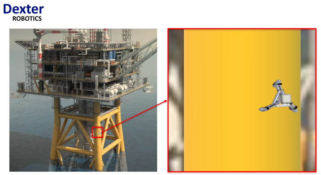 The IP68 Underwater Cling robot will move along the exterior of a ferrous structure to perform an inspection task and/or a maintenance task such as cleaning, as shown below.